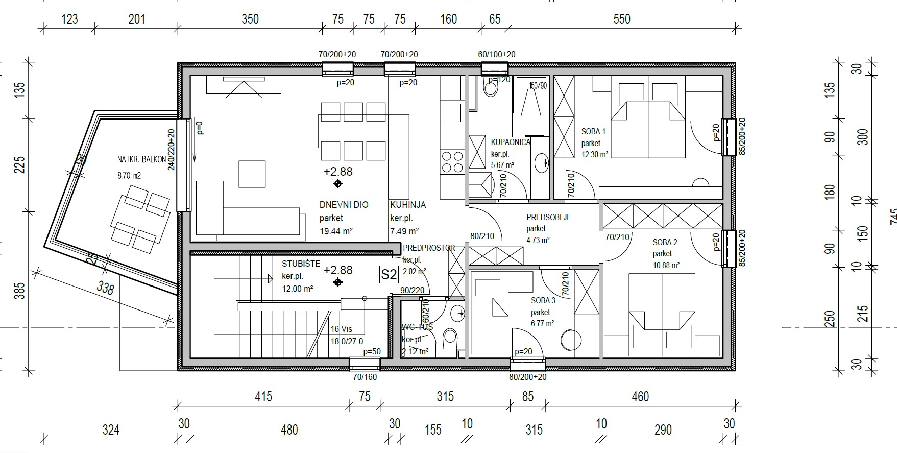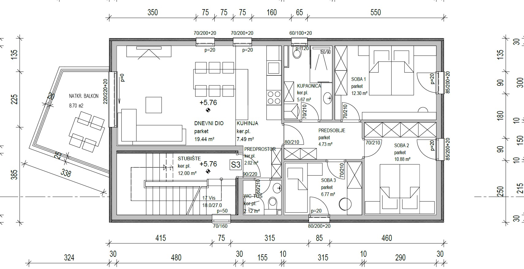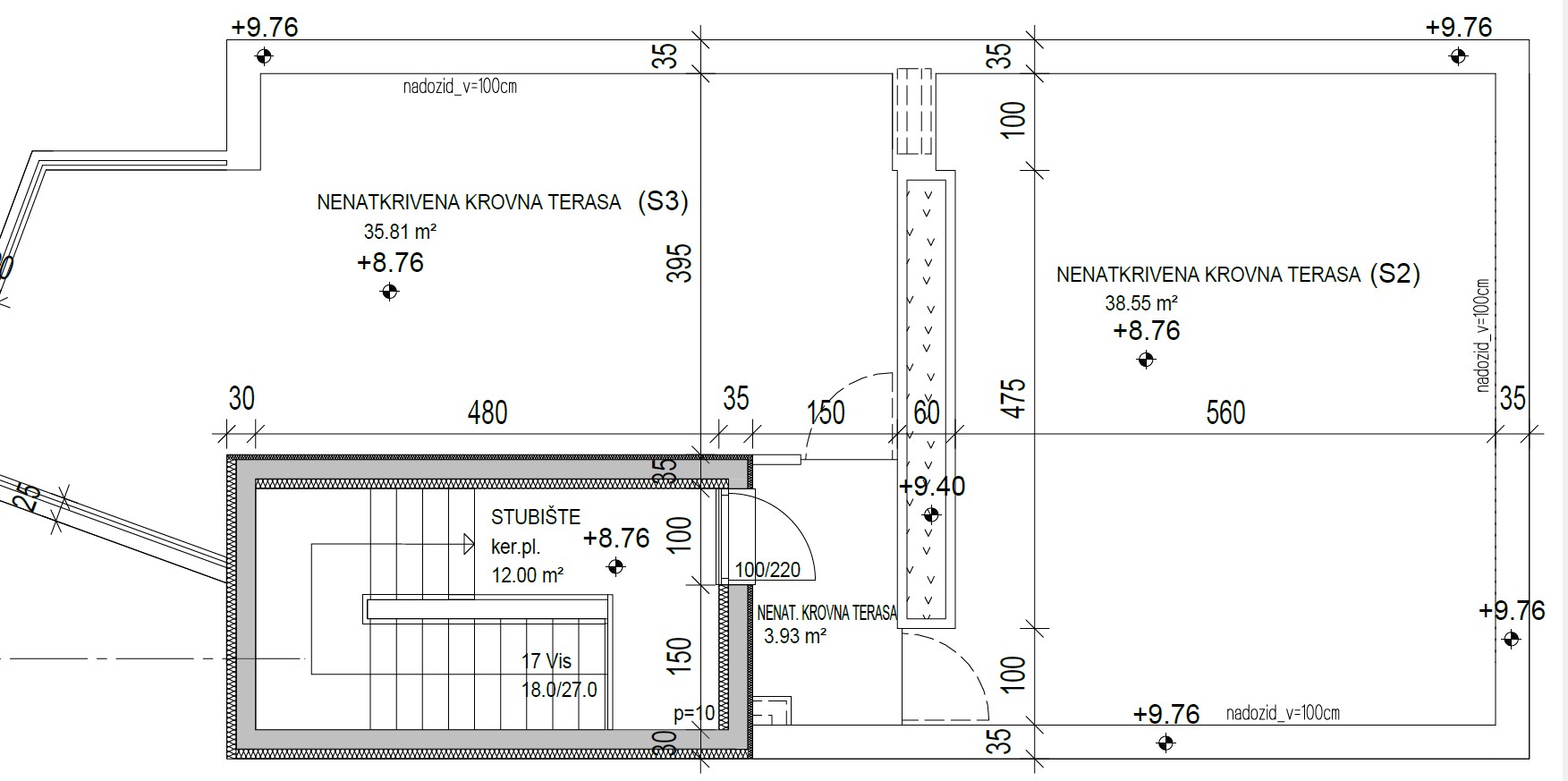 - Površina: Tlocrtna površina 80 m² (obračunska površina 75,77 m²) + 38,55 m² krovne terase