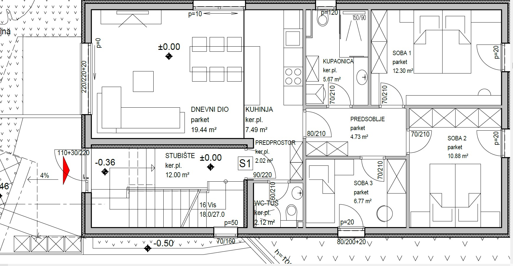 - Površina: Tlocrtna površina 80 m² (obračunska površina 75,77 m²) + 35,81 m² krovne terase